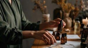 person-preparing-essential-oils-at-wooden-table-free-photo
